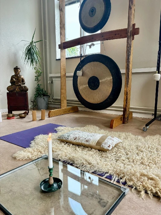 Gongmeditation är en form av ljudresa där gongarnas rika vibrationer omsluter dig som vågor. De skiftande tonerna hjälper nervsystemet att varva ner, sinnet att stillna och kroppen att släppa på lagrad spänning. Ljudet bär dig varsamt in i ett tillstånd mellan vakenhet och sömn, där stress löses upp och närvaro får ta plats.