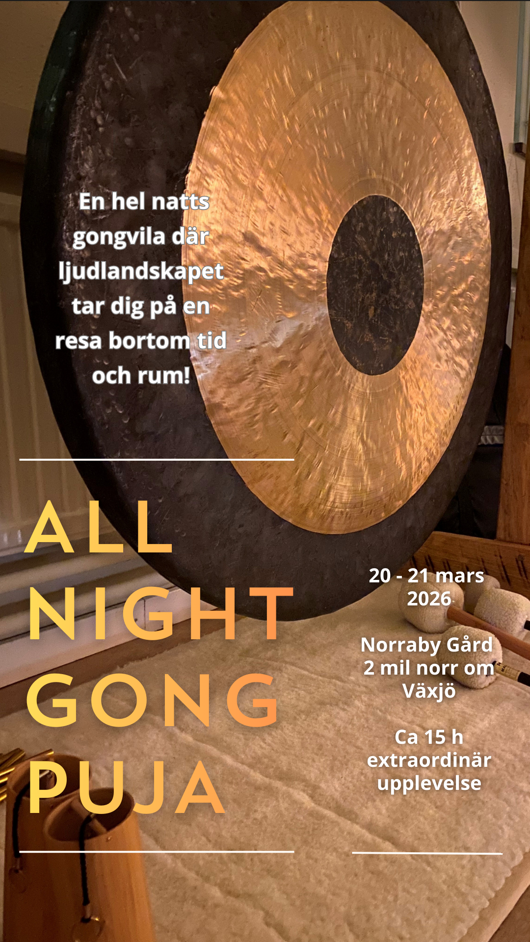 kl 22.00 börjar Gongarna vibrerar och sjunger oss in i sömnen eller vilan. Gongarnas klanger dansar runt om oss ända till kl 6.00.